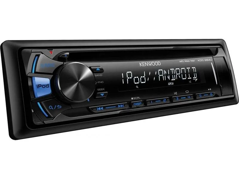 KDC-264UB оснащена 13-символьным ЖК-дисплеем при наличии белой подсветки LED, подсветки кнопок управления синего цвета, возможность переключения между дополнительными устройствами: 5 дисков.